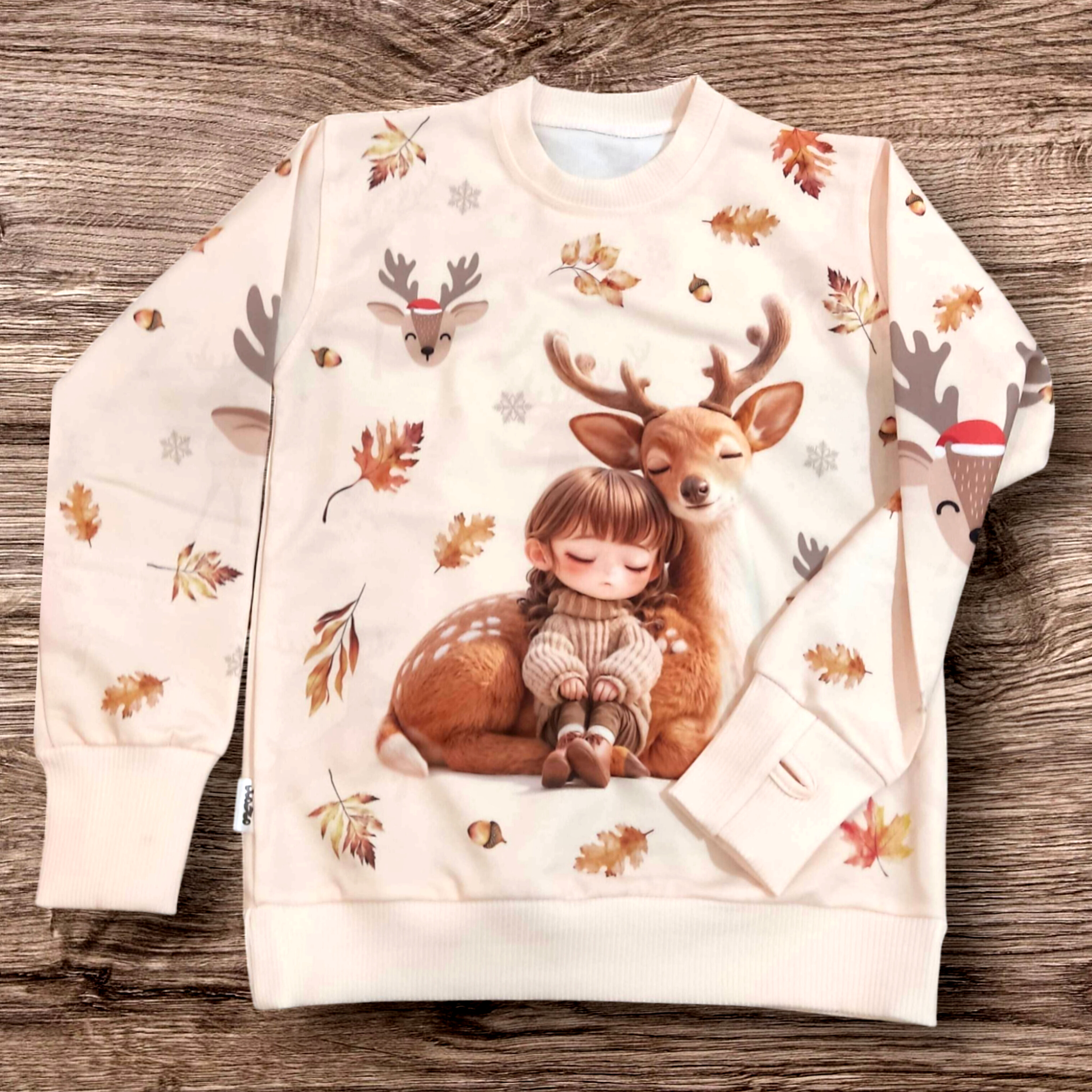 بلوز دخترانه اسپرت سایز بزرگ طرح گوزن فینگردار جنس پارچه اسپان دورس رنگ کرمی سایز 60
