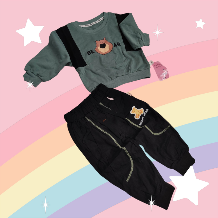 بلوز پسرانه سبز وارداتی و شلوار کتان مشکی با طرح خرسی، انتخابی ایدهآل برای پسران شما در روزهای سرد!